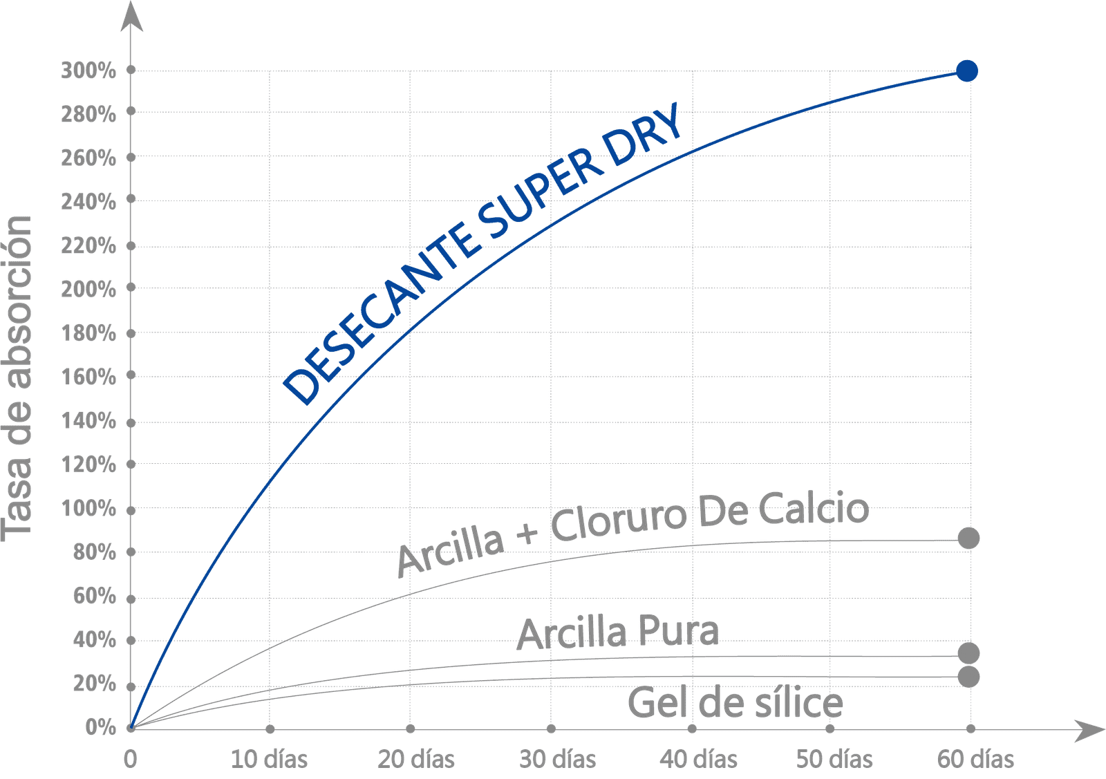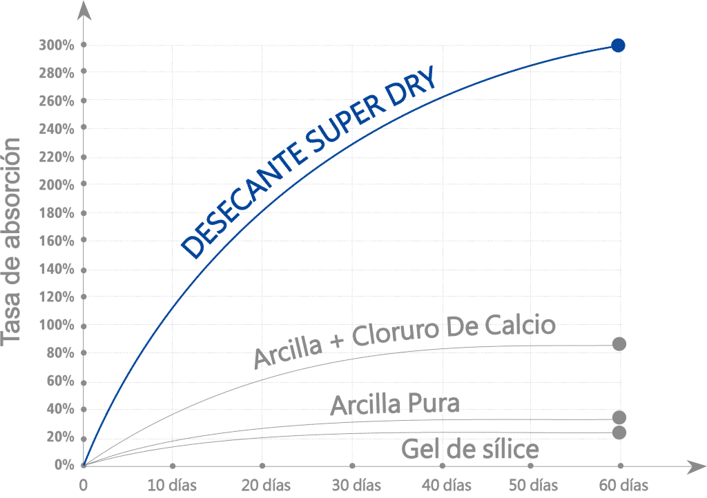 Los desecantes SUPER DRY tienen una capacidad de absorción verificada de más del 300% de su peso en seco y absorben la humedad de forma continua hasta 90 días en condiciones de temperatura que oscilan entre -5°C y +90°C.