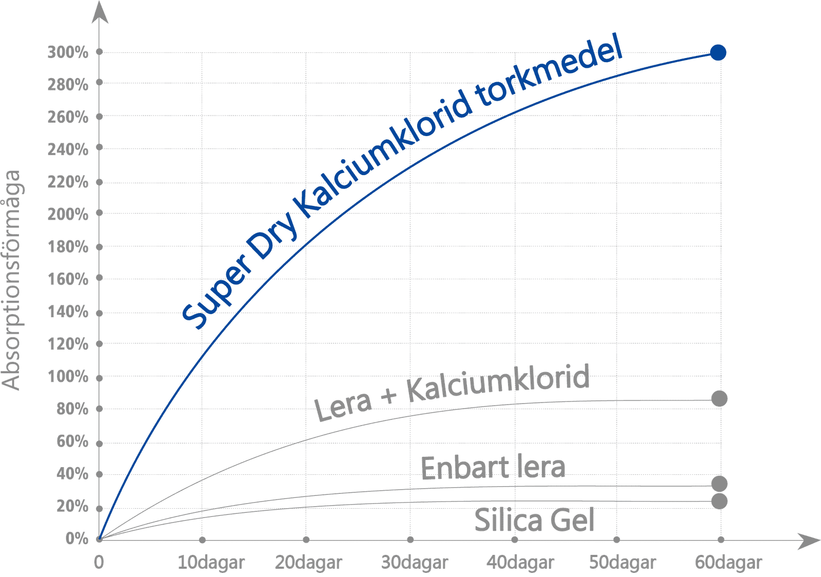 Super Dry’s torkmedel har en verifierad absorptionskapacitet på mer än 300 % av sin torrvikt och absorberar kontinuerligt fukt i upp till 90 dagar i temperaturförhållanden som sträcker sig från -5 °C till +90 °C.