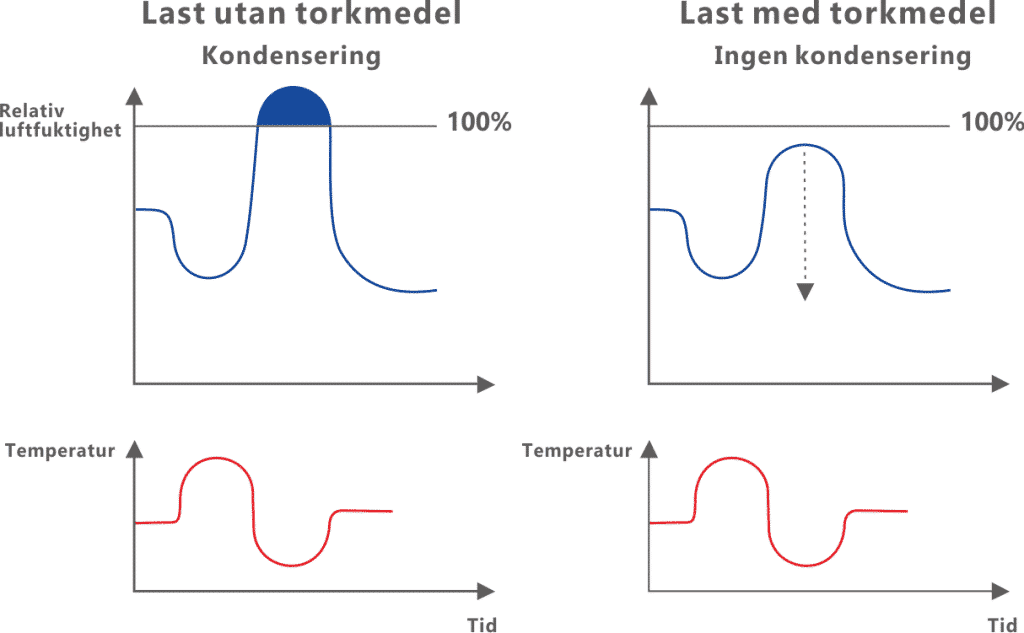 Genom att använda torkmedel minskas den relativa fuktigheten i containrar och produktförpackningar till under daggpunkten under transport och längre lagringsperioder. Lasten skyddas från de skadliga effekterna av vattenkondensering.