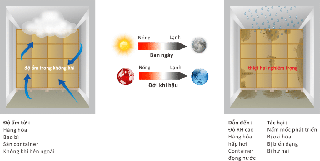Hàng hóa vận chuyển đường biển trong container thường có nguy cơ bị ẩm mốc cao vì vùng vi khí hậu bên trong container là một môi trường lý tưởng làm tăng nguy cơ bị thiệt hại do độ ẩm. Trong vận tải đường biển, nhiệt độ bên trong container thường dao động rất lớn. Nhiệt độ giảm dẫn đến xảy ra hiện tượng ngưng tụ nước, vì độ ẩm trong không khí lạnh thấp hơn không khí ấm.